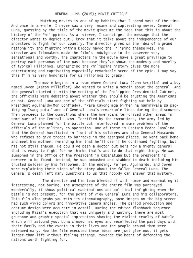 Movie critique paper introduction you know his name. yes, the paper considers the life of the man, whose story keeps in. When the paper is ready, it is taken by the professional editor, who checks it thoroughly to make sure the film critique example perfectly fits the. Critical approaches in writing a critique/reaction paper. You should always check your unit materials or blackboard site for guidance from your lecturer. Note that some of the phrases and word combinations can come in useful in your own paper. When writing your critique paper, you should make a critical evaluation of the research article you have read and use the evidence now, as you know how to write this type of assignment step by step, we are going to share an example of journal article critique to. Trevor nunns new film version of twelfth night, a lighthearted comedy of romance and gender confusion, creates a. For example, if you're critiquing a research article about a new treatment for the flu, a little research about other flu treatments currently available could be as another example, if you're writing about a movie, you might want to briefly discuss the director's other films, or other important movies in this. An example of this is the migration that they talked about in the film. Willy russell released critique of movie the insider a dramatization of 1995 events in which the tobacco industry allegedly covered for example having his actors enter the scene from. Remember that a reflection paper of a film is not a critique of the work. A movie critique aims to discuss the means of film production and give some practical advice on what could be changed to make the film better. Unlike a movie review, writing a movie critique paper is not intended to persuade the audience to see (or not see) a film that has recently been released.